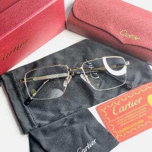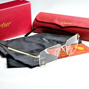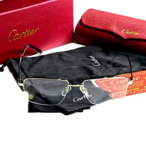 Introducing the exquisite Cartier Half Rim Full Metal Eyewear, a stunning addition to any eyewear collection that seamlessly blends luxury with functionality. This unisex design features a sophisticated half-rim construction, crafted from high-quality metal that ensures durability while providing a lightweight feel for all-day comfort. The eyeglasses are elegantly presented in a striking red box, symbolizing the brand’s commitment to opulence and style. The bold red lenses not only make a fashion statement but also offer a unique twist to traditional eyewear, allowing the wearer to express their individuality with confidence. Perfect for both casual and formal occasions, these Cartier eyeglasses are an essential accessory for those who appreciate the finer things in life, embodying the essence of timeless elegance and modern sophistication.